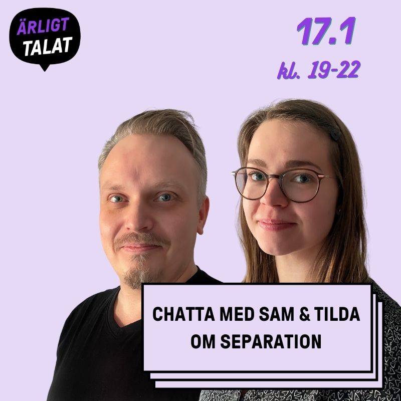 Den 17.1 kl. 19-22 kan du prata anonymt med Sam Jansson & Tilda Kalliokoski från öppenvårdsenheten vid Vasa mödra- och skyddshem om att leva med föräldrar som har separerat eller planerar att separera på Ärligt talat-chatten.