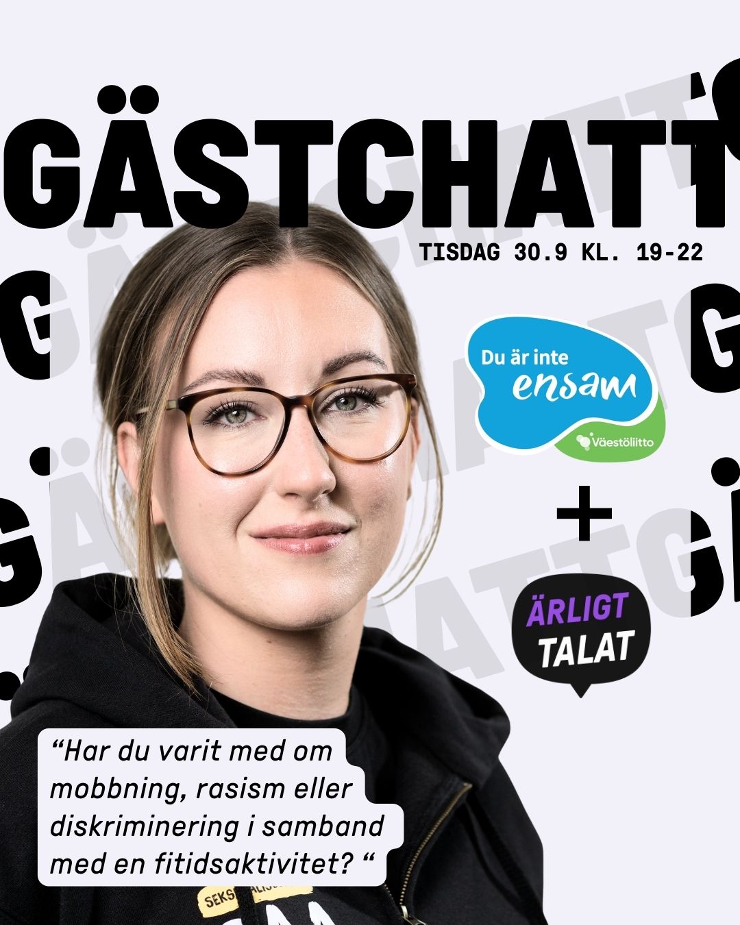 Den 30 september gästas Ärligt talat-chatten av Nea Bäck, som arbetar med tjänsten Du är inte ensam. Du är inte ensam är Finlands första supporttjänst där idrottare eller andra hobbyutövare som utsatts för osakligt beteende kan få hjälp och stöd.