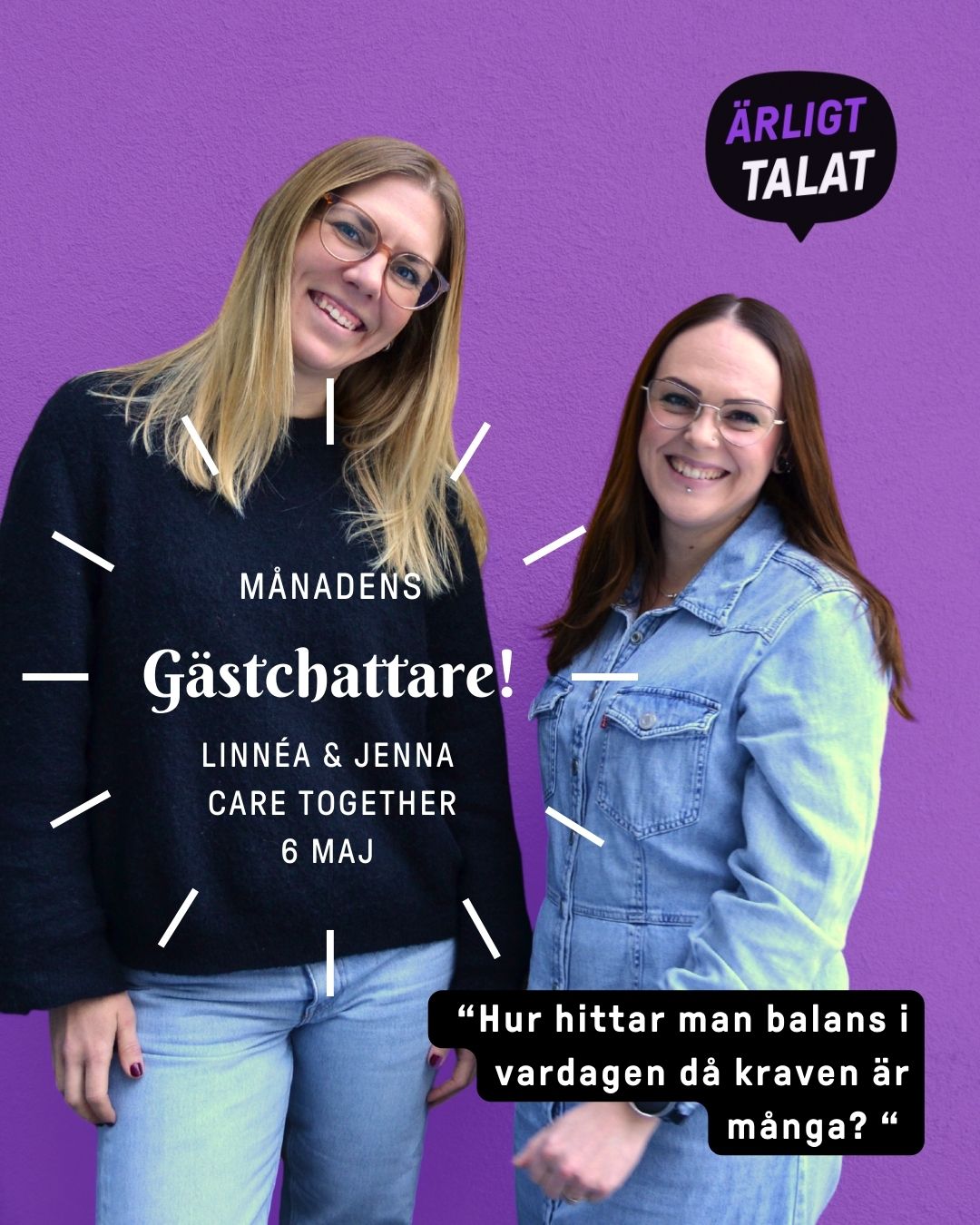 Den här månaden har du möjlighet att chatta med Jenna och Linnea från Care Together – ett projekt som jobbar för ungas välmående. Deras vision är att unga skall ha de verktyg och redskap som behövs för att hantera framtiden. Långvarig stress, sömnproblem, känslomässiga utmaningar, ångest och negativa tankar påverkar livskvaliteten. Vi har en övertygelse om att kunskap kan motivera till förändring och stärka självbilden. Alla förtjänar en meningsfull vardag.